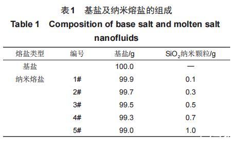 本實(shí)驗(yàn)所用材料為NaNO3、KNO3和30nm的SiO2納米顆粒。所有實(shí)驗(yàn)材料在制備納米熔鹽之前均需要經(jīng)過干燥處理。使用型號(hào)為Mettler Toledo ME104,精度為0.1mg的電子天平對(duì)干燥后的熔融鹽和納米顆粒進(jìn)行稱量。見表1,按照比例將基鹽及納米顆粒進(jìn)行稱量后,利用高溫熔融法將SiO2納米顆粒均勻分散至基鹽中,將制備好的納米熔鹽樣品放入干燥箱中保存?zhèn)溆谩?