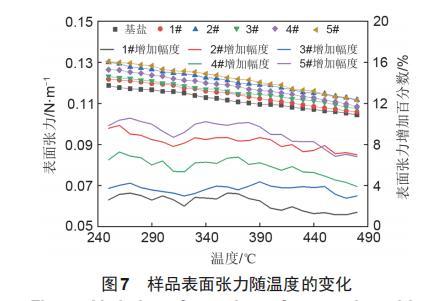 樣品的表面張力值隨溫度變化如圖7所示??梢钥吹?,在250~480℃內(nèi),基鹽的表面張力在0.1044~0.1188N/m,表面張力隨溫度的升高呈下降趨勢(shì)。1#納米熔鹽的表面張力在0.1059~0.1219N/m,對(duì)數(shù)據(jù)進(jìn)行擬合后,擬合系數(shù)在0.995以上,擬合程度較好。2#納米熔鹽的表面張力在0.1117~0.1301N/m,擬合系數(shù)為0.996,隨溫度變化的趨勢(shì)和基鹽及一般熔鹽表面張力的變化趨勢(shì)保持一致,均隨溫度的升高呈下降趨勢(shì)。3#和4#納米熔鹽的表面張力在0.1075~0.1232 N/m和0.1085~0.1265 N/m,擬合系數(shù)都在0.994以上,其中4#納米熔鹽的擬合系數(shù)與2#納米熔鹽的擬合系數(shù)相同,均為0.996,擬合程度最好。5#納米熔鹽的表面張力在0.1115~0.1305N/m,擬合系數(shù)為0.991。