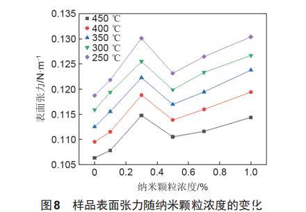 圖8為不同溫度工況點(diǎn)下樣品表面張力隨納米顆粒濃度的變化情況。