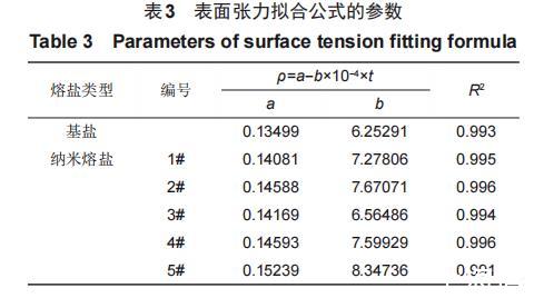 利用拉筒法對(duì)配制的基鹽及5種加入30nm SiO2納米顆粒的納米熔鹽的表面張力進(jìn)行測(cè)量,每隔10℃進(jìn)行一次測(cè)量,對(duì)得到的實(shí)驗(yàn)數(shù)據(jù)進(jìn)行整理和分析,擬合公式以及擬合系數(shù)見表3。