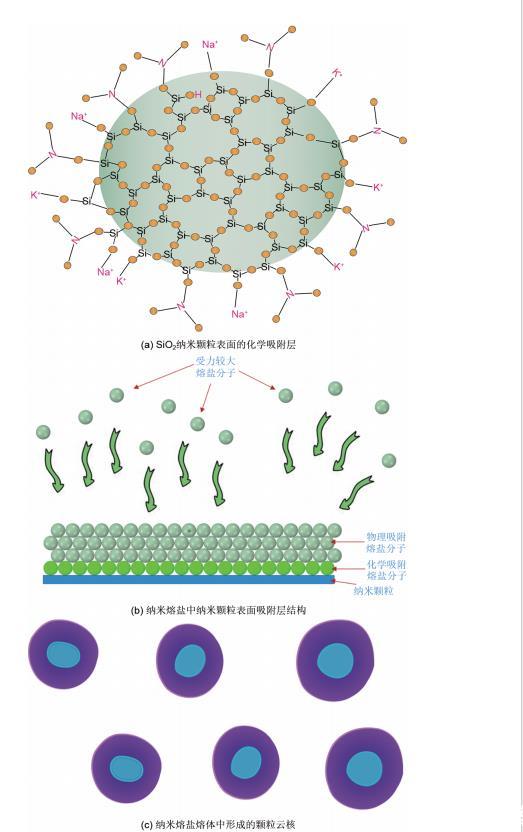 (4)采用高溫熔融法制備納米熔鹽時(shí),由于SiO2納米顆粒表面缺少配位的原子,熔融鹽分子會(huì)在SiO2納米顆粒周圍先形成化學(xué)吸附層,隨后由于攪拌的作用,形成物理吸附層,最終以納米云核的形式存在于熔鹽體系中。