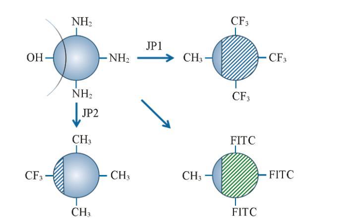 將具有APS和OTS的SiO?顆粒分散在2.4×10?2 mol/L PFOA的甲苯溶液中并攪拌48 h。通過蒸發(fā)除去溶劑,再多次離心洗滌,然后在110℃下退火2 h,將所制得的顆粒命名為JP1,制備過程如Scheme 1所示。