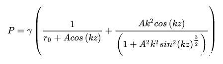 這里,是未受到擾動(dòng)的水柱半徑,A表征擾動(dòng)的大小,而k是波數(shù),表示擾動(dòng)范圍的大小。很容易,我們可以計(jì)算出兩個(gè)方向的曲率半徑,進(jìn)而根據(jù)Young-Laplace方程計(jì)算出流體內(nèi)部各處的壓力(我們假定外壓為零):