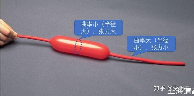 氣球內(nèi)部的氣體壓力處處相等,但是,接觸過這種氣球的人都有一個(gè)經(jīng)驗(yàn),就是粗的地方繃得緊,而細(xì)的地方繃得就不那么緊。如上圖所示,繃得緊的地方和繃得松的地方,產(chǎn)生的壓力差是相等的,但是他們的曲率是不相等的:曲率越大,同樣的張力所能產(chǎn)生的壓力差就更大。