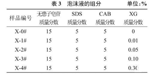 表3為泡沫溶液的配方。根據(jù)三元復(fù)配體系的發(fā)泡性能,選取發(fā)泡性能最佳的9號(hào)組,無(wú)患子皂苷、SDS、CAB質(zhì)量分?jǐn)?shù)固定在15%、5%、5%。研究XG濃度變化對(duì)泡沫溶液性能的影響。