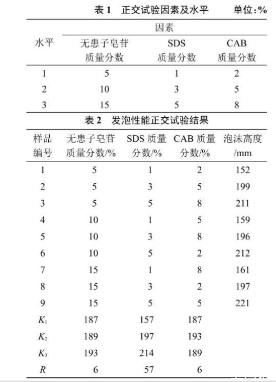 以發(fā)泡體系的復(fù)配組分(無(wú)患子皂苷、SDS、CAB 3種表面活性劑)為考察的3個(gè)因素,根據(jù)3種表面活性劑的發(fā)泡性能,每個(gè)因素選3個(gè)水平,選用L9(33)正交試驗(yàn)設(shè)計(jì)優(yōu)化泡沫滅火劑的配方,正交表設(shè)計(jì)如表1所示。