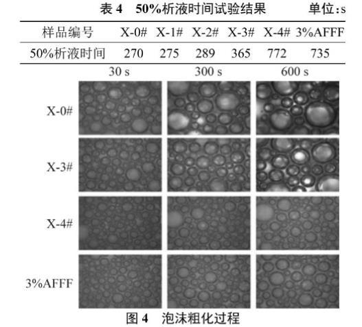 泡沫的穩(wěn)定性主要由泡沫的排水、粗化和聚并等多因素決定[10]。雙注射器技術(shù)產(chǎn)生的6種泡沫的圖像見(jiàn)圖3,而6種泡沫的50%析液時(shí)間測(cè)定結(jié)果見(jiàn)表4。這6種泡沫在0 s時(shí)有相同的初始體積,在重力作用下發(fā)生泡沫排水現(xiàn)象,600 s后6種泡沫的排水體積之間存在很大的差異,X-0#、X-1#和X-2#樣品泡沫排水量幾乎達(dá)到發(fā)泡前泡沫溶液的初始體積,X-3#泡沫排水量明顯降低,X-4#泡沫的排水體積較3%AFFF的排水體積少。以上結(jié)果表明添加質(zhì)量分?jǐn)?shù)0.30%的XG能很好地減緩泡沫排水,使無(wú)氟泡沫和商用泡沫滅火劑有相當(dāng)?shù)呐菽€(wěn)定性。