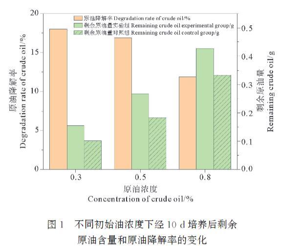 圖1不同初始油濃度下經10d培養(yǎng)后剩余原油含量和原油降解率的變化