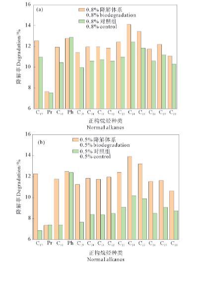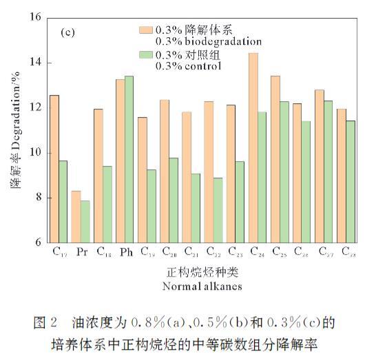 圖2油濃度為0.8%(a)、0.5%(b)和0.3%(c)的培養(yǎng)體系中正構烷烴的中等碳數組分降解率