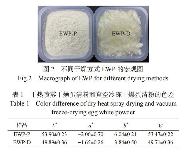 如圖2所示,EWP-P為細膩的鵝黃色顆粒粉末,EWP-D為松散的黃色片狀物。EWP-P的L*、a*和b*值分別為53.90±0.23、?2.06±0.70和6.04±0.21。EWP-D的L*、a*和b*值分別為49.89±0.36、?1.65±0.26和3.84±0.50(表1)。EWP-P的b*值較大是因為蛋清蛋白中的葡萄糖在噴霧干燥過程中與蛋白發(fā)生了美拉德反應。此外,真空冷凍干燥需將樣品進行冷凍預處理,冷凍過程中,蛋清蛋白會發(fā)生褐變反應,故EWP-D最終呈現(xiàn)出的顏色較EWP-P黃(圖2)。EWP-P的顏色較EWP-D白(圖2),可能是因為干熱噴霧干燥的干燥速度快,蛋清中的蛋白質(zhì)受熱時間短。因此在本實驗干燥條件下,干熱噴霧干燥所得的蛋清蛋白粉更亮、更白,易被消費者接受。