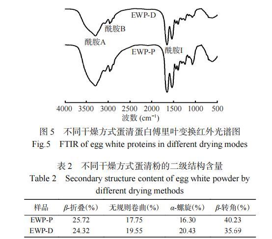 不同干燥方式蛋清蛋白的紅外光譜如圖5所示。EWP-P和EWP-D在酰胺A帶(3700~3200 cm?1)處有強吸收峰,EWP-P的峰強大于EWP-D,表明干燥方式會影響蛋清蛋白的水合能力,這可能與蛋白質(zhì)分子中N-H鍵舒展并與氫鍵形成了締合體,或蛋白質(zhì)分子與葡萄糖以共價鍵結(jié)合有關。酰胺B帶(2961.64 cm?1)的弱吸收峰主要由C-N鍵產(chǎn)生。酰胺I帶(1600~1700 cm?1)信號主要由C-O鍵伸縮振動引起,與蛋白質(zhì)的二級結(jié)構(gòu)有關,涉及β-折疊(1600~1640 cm?1)、無規(guī)則卷曲(1640~1650 cm?1)、α-螺旋(1650~1660 cm?1)和β-轉(zhuǎn)角(1660~1700 cm?1)。采用Peak fit軟件對不同干燥方式蛋清蛋白的酰胺I帶峰強進行高斯曲線擬合分析,根據(jù)峰面積計算其二級結(jié)構(gòu)的相對百分含量,結(jié)果如表2。EWP-P和EWP-D的二級結(jié)構(gòu)以β-折疊和β-轉(zhuǎn)角為主,EWP-P的β-折疊含量增加主要與卵轉(zhuǎn)鐵蛋白熱變性有關,同時分子間的β-折疊結(jié)構(gòu)也易轉(zhuǎn)變?yōu)棣?轉(zhuǎn)角結(jié)構(gòu)。而α-螺旋下降可能是因為熱變性導致α-螺旋中的氫鍵斷裂,進而發(fā)生了解螺旋現(xiàn)象。EWP-P無規(guī)則卷曲增加,表明其部分有序結(jié)構(gòu)向無規(guī)則卷曲轉(zhuǎn)化,蛋白變性明顯,結(jié)構(gòu)的隨機性增強。