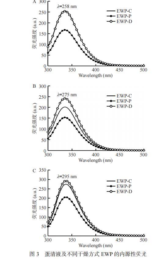 蛋白質(zhì)的固有熒光來自于內(nèi)部的芳香族氨基殘基(酪氨酸Tyr、色氨酸Trp、苯丙氨酸Phe),其熒光最大值(λmax)、強度對其微環(huán)境的極性極其敏感,因此可用來表征蛋白質(zhì)的三級結(jié)構(gòu)變化,其中Trp、Tyr和Phe的特有熒光激發(fā)波長分別為295、275和258 nm。如圖3所示,與EWP-C相比,不同干燥方式制備的蛋清粉的固有熒光強度降低但熒光峰的位置未有明顯的遷移。EWP-P的熒光強度低于EWP-D于EWP-C,可能是因為噴霧干燥的干燥溫度高,蛋清蛋白變性程度大,芳香族氨基酸殘基暴露于更極性環(huán)境中,進而發(fā)生了熒光猝滅現(xiàn)象。此外,EWP-P的熒光強度較低還可能是由于蛋清蛋白中含有葡萄糖,在高溫下會與蛋白質(zhì)發(fā)生美拉德反應,屏蔽了芳香族氨基殘基。