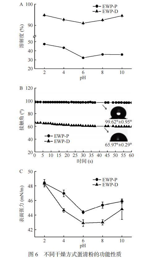 溶解性是蛋白重要的功能特性之一,與接觸角、表面張力、乳化性等密切相關。如圖6A,不同pH下不同干燥方式的蛋清粉溶解度的測量。EWP-P的溶解度隨著pH的升高先減小后增大,這可能是因為在酸性和堿性環(huán)境中球狀蛋白質(zhì)會發(fā)生部分展開,形成熔融球狀構(gòu)象,變得更加靈活,更容易與水分子作用。pH為6.0時蛋清蛋白的溶解度最低,可能是因為該pH與蛋清蛋白中大部分蛋白的等電點相近,蛋白帶電荷量較少,因此容易發(fā)生沉淀。與EWP-P相比,EWP-D在pH6.0時溶解度的下降程度較小,這可能與真空冷凍干燥后蛋清蛋白的微觀結(jié)構(gòu)呈片狀,具有較大的比表面積有關,也可能是因為冷凍干燥蛋白質(zhì)在脫水過程中蛋白質(zhì)變性低,促進了可溶性聚集物生成。EWP-D的溶解度遠大于EWP-P,這是因為噴霧干燥是直接將蛋清液霧化后再干燥,其蛋清粉表面會形成一個光滑、抗?jié)裥缘谋∧?,最終導致蛋白的溶解性降低,復水性差且易結(jié)塊。而真空冷凍干燥經(jīng)過冷凍升華,可保持食品原有的形狀故具有很好的速溶性和復水性。Shaviklo等也發(fā)現(xiàn)噴霧干燥的含添加劑(花粉)蛋白的蛋白質(zhì)溶解度明顯低于凍干蛋白。