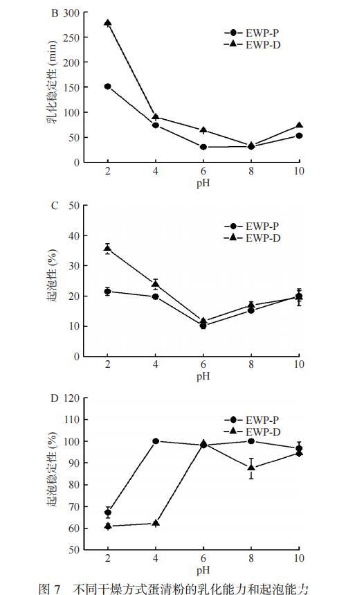 泡沫的形成依賴于由蛋白質(zhì)形成的界面膜及其在懸浮液中保持氣泡和減緩聚結(jié)速率的能力,其中蛋白質(zhì)的發(fā)泡能力和穩(wěn)定性與蛋白與水相在界面上的相互作用有關(guān),受蛋白分子柔性、凈電荷、構(gòu)象和疏水性的影響。蛋清蛋白在pH2.0~10.0條件下的起泡性如圖7C所示,EWP-D的起泡性優(yōu)于EWP-P,這可能是由于EWP-D的溶解度較高,在起泡過程中蛋白能迅速展開,形成能同時連接水相溶劑與空氣界面的兩性介質(zhì),而自身的帶電性又可產(chǎn)生一定的靜電排斥,使蛋白分子在空氣-水界面上呈現(xiàn)規(guī)律性排列,而不會發(fā)生聚集。相比之下,EWP-P在高溫發(fā)生的美拉德反應(yīng)會使蛋白形成更大的空間位阻,進(jìn)而延緩了蛋白質(zhì)在空氣/液體界面的吸附。pH為6.0時,EWP-P和EWP-D的起泡性較低,分別是10.19%±1.01%和11.7%±0.66%,這是由于該pH下蛋白的溶解度和表面張力較低,蛋白易發(fā)生聚集,故不易形成泡沫。