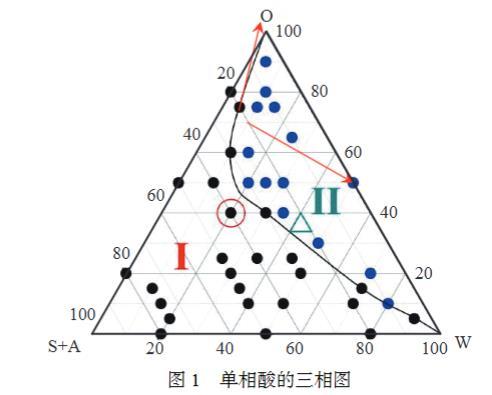 通過擬三元相圖制備單相酸相圖,根據(jù)油相(O)、酸相(W)、表面活性劑(S)+助表面活性劑(A)的比例進(jìn)行三相圖的繪制。室溫下,固定油相(O)的加量,固定非離子表面活性劑(S1)與陽(yáng)離子表面活性劑(S2)的質(zhì)量比,固定表面活性劑(S,S=S1+S2)與助表面活性劑(A)的質(zhì)量比。將不同比例下的液體進(jìn)行離心,然后進(jìn)行觀測(cè),觀察體系由澄清透明(一相)變?yōu)榛鞚幔ǘ啵┑南嘧冞^程,在每次發(fā)生相變的同時(shí)記錄所滴加鹽酸的量,以O(shè)、S+A、W為三相,繪制擬三元相圖,見圖1。由圖1可知,在圖1的紅圈標(biāo)記區(qū)域,配方的經(jīng)濟(jì)性最好,是維持單相區(qū)域最小的表面活性劑用量(S+A),且該配方下的單相酸遇水遇油后仍可在較大范圍內(nèi)保持單相。