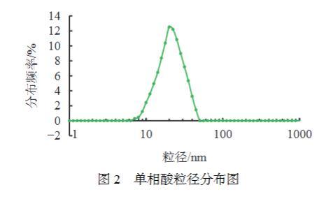 采用激光粒度分析儀對(duì)單相酸粒徑及分布進(jìn)行了測(cè)定,實(shí)驗(yàn)結(jié)果見圖2??芍獑蜗嗨崃酱笮》植荚?~50 nm范圍之內(nèi),分布較窄,為高斯分布,在單相微乳粒徑范圍內(nèi)。