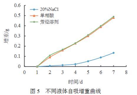 設(shè)置不同液體進(jìn)行自吸實(shí)驗(yàn),對(duì)比親油巖心對(duì)于不同液體的自吸能力,實(shí)驗(yàn)結(jié)果見圖5。對(duì)孔隙介質(zhì)而言,潤(rùn)濕性控制兩相或多相流體的分布和流動(dòng)。平衡時(shí)濕潤(rùn)相與孔隙表面相互接觸,而非濕相占據(jù)孔隙的中央位置,介質(zhì)中發(fā)生兩相或多相流動(dòng)時(shí),毛管力與濕相流動(dòng)方向一致,是非濕相自發(fā)進(jìn)入巖心介質(zhì)驅(qū)替潤(rùn)濕相的阻力,對(duì)于油濕巖心介質(zhì),很難發(fā)生水的自吸。從實(shí)驗(yàn)結(jié)果可以看出,單相酸自吸效果和芳烴溶劑十分接近。