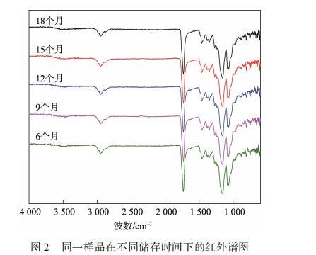 為了探究表面轉(zhuǎn)移涂層是否發(fā)生了結(jié)構(gòu)變化,對(duì)不同儲(chǔ)存時(shí)間下的樣品進(jìn)行紅外光譜測(cè)試分析,見(jiàn)圖2??梢钥闯?,儲(chǔ)存時(shí)間為6—18個(gè)月的樣品的紅外譜圖并未發(fā)生明顯變化。譜圖的一致性證明了噴鋁紙表面轉(zhuǎn)移涂層的基本結(jié)構(gòu)并未隨著時(shí)間發(fā)生明顯變化,即掉墨現(xiàn)象的出現(xiàn)并非由于轉(zhuǎn)移涂層出現(xiàn)結(jié)構(gòu)變化導(dǎo)致。根據(jù)相關(guān)研究,噴鋁紙?jiān)趦?chǔ)存的時(shí)候,紙張及涂層中添加的助劑,環(huán)境介質(zhì)中的水分子、油污和空氣等小分子物質(zhì)會(huì)通過(guò)吸附、擴(kuò)散、遷移和凝集等作用,甚至鍵合等途徑,在轉(zhuǎn)移涂層表面形成低分子物質(zhì)的富集區(qū),即弱界面層,降低了轉(zhuǎn)移涂層的表面張力,并使其印刷適性變差。