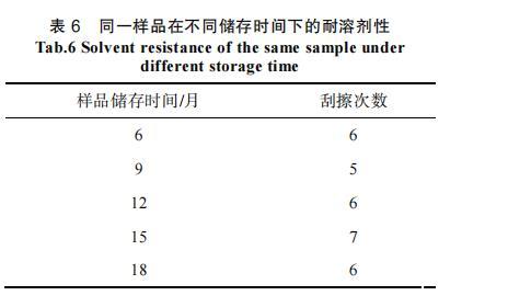 表6同一樣品在不同儲(chǔ)存時(shí)間下的耐溶劑性