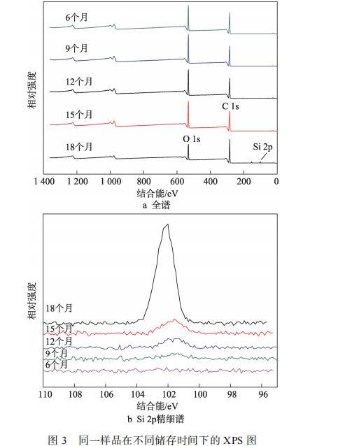 為了探究噴鋁紙表面析出的小分子物質(zhì)的成分,筆者通過XPS分析儲(chǔ)存時(shí)間為6個(gè)月、9個(gè)月、12個(gè)月、15個(gè)月、18個(gè)月紙張表面元素的變化,見圖3a。在XPS光譜圖中,可以觀察到C 1s,O 1s的特征峰,結(jié)合能分別為285.1、532.3 eV。第18個(gè)月紙張的XPS光譜圖中,出現(xiàn)了Si 2p的特征峰,結(jié)合能為102 eV。由圖3b和表4可知,6—15個(gè)月硅含量逐漸增加,元素原子數(shù)分?jǐn)?shù)由0增至0.6%,但均未出現(xiàn)成型的峰。18個(gè)月的紙張表面硅原子數(shù)分?jǐn)?shù)劇增為3.5%。這表明隨著儲(chǔ)存時(shí)間增加,紙張表面逐漸有含硅的無機(jī)小分子析出。此外,由表4也可看出,18個(gè)月的樣品表面C原子數(shù)分?jǐn)?shù)明顯升高,從69.9%升至75.1%,O原子數(shù)分?jǐn)?shù)則由29.5%降低至20.0%,證明硅主要以Si?C鍵的形式存在,析出的有機(jī)硅形成了低分子物質(zhì)弱界面層,降低了樣品涂層的表面張力。