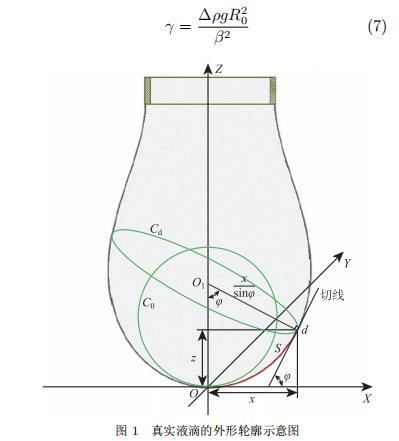 在 Young-Laplace 理論方程的基礎(chǔ)上,Bashforth 和 Adams 通過進一步推導(dǎo)得到了懸滴法和躺滴法的表面張力測量工作方程,懸滴法的測量工作方程主要基于兩個基本假設(shè):1) 懸垂液滴在重力和表面張力的共同作用下處于平衡狀態(tài);2) 懸垂液滴的形狀呈現(xiàn)完美的中心軸對稱。對處于平衡狀態(tài)的真實懸垂液滴,通過圖像處理軟件精準提取液滴的外形輪廓,以液滴頂點為坐標原點建立空間直角坐標系,如圖 1 所示,則液滴輪廓 d 點應(yīng)滿足的關(guān)系式為:
