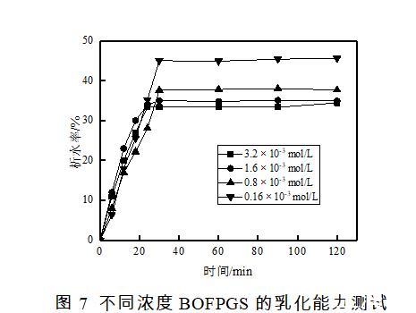 將同等體積的BOFPGS水溶液與液體石蠟混合均勻之后,在50℃恒溫中靜置觀察所形成的乳液析水情況,析水率越小說明乳化能力越強,形成的乳液越穩(wěn)定。BOFPGS與液體石蠟形成乳液的析水率如圖7所示。從圖7可以看出,乳液隨著靜置時間增加,析水率增大,約在30 min以后乳液達到穩(wěn)定,析水率趨于平衡。BOFPGS濃度越大乳液越穩(wěn)定,析水率越低,BOFPGS濃度為0.8×10-3、1.6×10-3和3.2×10-3 mol/L的乳化性能接近,相較于KANG等人合成的短氟鏈陰離子表面活性劑(在表面活性劑質(zhì)量分數(shù)為1%的水溶液中才能表現(xiàn)出穩(wěn)定的乳化性能),BOFPGS的用量更低,具有更好的乳化性能,可大大降低BOFPGS的使用成本。