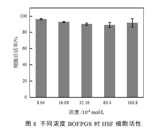 表面活性劑的毒理性質(zhì)是評價表面活性劑安全性的重要參數(shù),采用MTT法來測試BOFPGS對細胞活性的影響。將濃度梯度為8.04×10-6 1.6×10-4 mol/L(5~100 mg/L)的BOFPGS加入到96孔板中培養(yǎng)HSF細胞24 h,細胞活性變化情況如圖8所示。從圖8可以看出,HSF細胞在BOFPGS濃度為8.04×10-6 1.6×10-4 mol/L作用下其細胞活性都在90%以上。說明在8.04×10-6 1.6×10-4 mol/L濃度范圍內(nèi),BOFPGS對HSF細胞沒有表現(xiàn)出明顯的毒性的,有望作為環(huán)保、安全的產(chǎn)品進行使用。