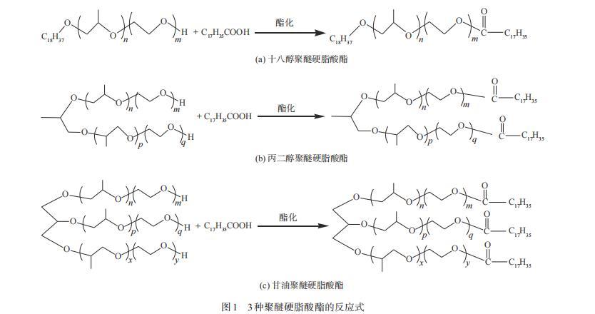 圖1 3種聚醚硬脂酸酯的反應(yīng)式