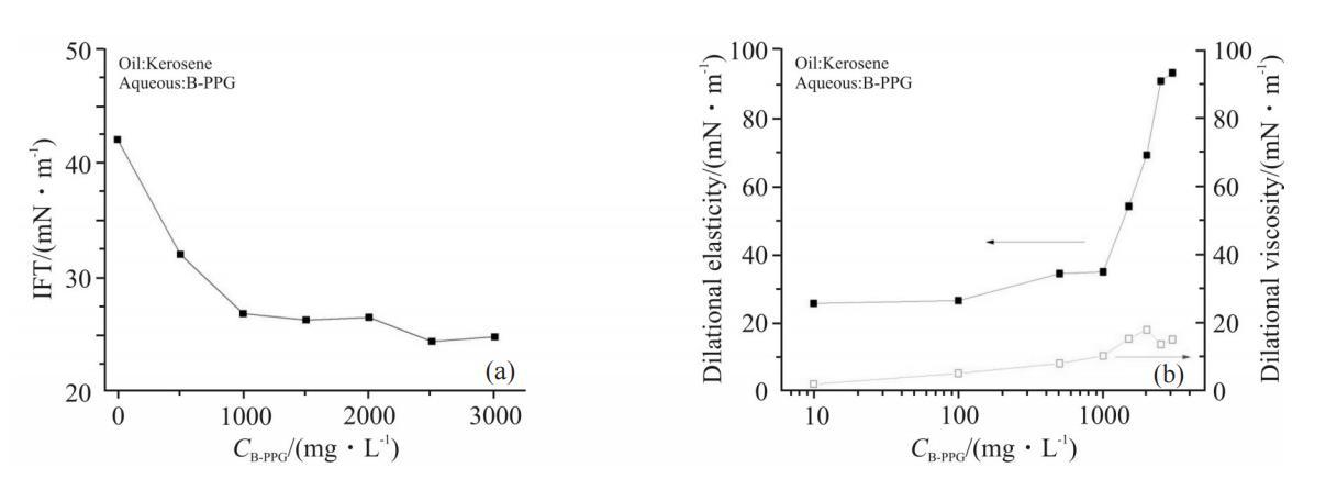 B-PPG是部分支化、部分交聯(lián)的聚丙烯酰胺,其分子結構中既含有親水基團丙烯酰胺,又含有疏水的烷基鏈,是一種高分子量的界面活性物質(zhì),能夠在油水界面上自發(fā)地吸附成膜,降低界面張力。Fig.2為B-PPG濃度對煤油-水界面張力和界面擴張流變參數(shù)的影響。由Fig.2(a)可知,B-PPG溶液具有一定的界面活性,隨著其濃度增大,界面張力逐漸降低,濃度高于1000mg/L后,達到平臺值,約為25為mN/m。由Fig.2(b)可以看出,濃度低于1000mg/L時,B-PPG形成的界面膜強度較低,擴張彈性和擴張黏性隨濃度緩慢增大。擴張彈性從約25mN/m升高到35mN/m,擴張黏性從約1mN/m升高到10mN/m;當B-PPG濃度大于1000mg/L時,隨著濃度的增大,界面膜的擴張彈性顯著升高,濃度達到2000mg/L時,擴張彈性高達90mN/m;而擴張黏性變化不大,僅上升到約20mN/m。
