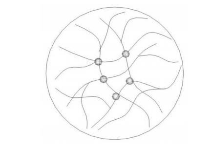 聚合物驅(qū)是油田開發(fā)穩(wěn)產(chǎn)增產(chǎn)最重要的技術手段之一,在國內(nèi)外油田得到了廣泛的應用。但聚驅(qū)后油藏儲層非均質(zhì)性加劇,剩余油分布更加分散,常規(guī)方法已經(jīng)無法滿足生產(chǎn)實踐的需要。近年來,改性聚丙烯酰胺已成為研究熱點,其中黏彈性顆粒驅(qū)油劑(B-PPG)由于其獨特的性能更是得以快速發(fā)展。B-PPG是通過多官能團引發(fā)合成的高分子支化鏈與三維交聯(lián)網(wǎng)絡結構共存的聚丙烯酰胺,其分子結構示意圖如Fig.1所示。這種“軟固體”凝膠顆粒以固體顆粒的形式懸浮于溶液中,具有較好的變形能力,運移過程中時堵時驅(qū),可以有效調(diào)節(jié)地層的非均質(zhì)性。同時,其又具有較好的耐溫抗鹽、耐老化能力。目前,B-PPG驅(qū)油劑已經(jīng)在勝利油田、河南油田推廣應用,增油降水效果明顯。
