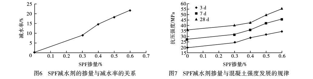 c.SPF高效減水劑應(yīng)用性能研究表明,隨著摻量的增大,減水率有成比例增加的趨勢,低摻量下即具有較強(qiáng)的減水分散效果,繼續(xù)增加摻量后減水率處于平緩狀態(tài)。摻加SPF高效減水劑對混凝土有明顯的增強(qiáng)作用,隨著減水劑摻量的增加,不同齡期的抗壓強(qiáng)度都在增加,同時混凝土早期強(qiáng)度發(fā)展很快,3d的強(qiáng)度可達(dá)到28d強(qiáng)度的60%—70%,7d強(qiáng)度可達(dá)到28d強(qiáng)度的80%—90%,混凝土后期強(qiáng)度也有增長的趨勢。