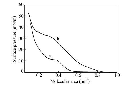 2種單體分子結構相似,CO2DA比CODA多了一CH?-CH?O一柔性間隔基,整個分子的舒展程度相對較大。當CODA分子在水面鋪展時,與水分子的相互作用小,分子"平躺"在水面上,當膜障壓縮單分子膜時,CODA分子受到側向壓力時容易發(fā)生滑移,形成多層膜。而CO2DA分子端基親水性相對較強,當膜障壓縮單分子膜時分子在水面能立起來,并與液面形成一定的夾角。因此CO2DA單分子膜占據(jù)面積較大,崩潰壓較高。