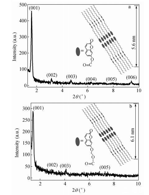 在2θ=2°~10°范圍內(nèi)出現(xiàn)的多個等距離Bragg衍射峰表明得到的CODA和CO2DA LB膜具有很好的周期性結構。假定從左至右Bragg衍射峰依次為(001),(002),...,(006),用Bragg方程對各級衍射峰進行計算可得CODA和CO2DA LB膜層狀結構間距為5.6nm和6.1nm。CO2DA LB膜的Bragg衍射峰較寬,強度較弱,Bragg衍射峰隨角度的增大衰減很快,說明CO2DA LB膜中分子排列較CODA LB膜中松散,存在局部的缺陷。理論計算充分展開的CODA和CO2DA分子鏈長約為3.5nm和3.6nm,所以觀察到的周期結構包含雙層的CODA和CO2DA分子。我們可以預想雙層結構的中間區(qū)域是香豆素基團經(jīng)過強烈的π-π堆積作用形成的,而雙層結構單元的外部為烷基側鏈。香豆素取代二乙炔單體的規(guī)則排列是二乙炔單元進行拓撲聚合的先決條件。