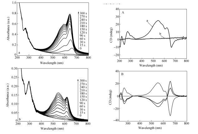 同時(shí)我們觀察發(fā)現(xiàn),香豆素端基螺旋堆砌方向與聚二乙炔主鏈螺旋方向存在一定的關(guān)系。如圖7(B)所示,CODA LB膜聚合后香豆素基團(tuán)在268nm處出現(xiàn)負(fù)的CD信號(hào),則聚二乙炔主鏈在550 nm處同樣出現(xiàn)負(fù)的CD信號(hào);香豆素基團(tuán)在268nm處出現(xiàn)正的CD信號(hào),則聚二乙炔主鏈在550 nm處同樣出現(xiàn)正的CD信號(hào)。兩者之間有一一對(duì)應(yīng)關(guān)系。香豆素端基的螺旋排列決定了聚二乙炔主鏈螺旋結(jié)構(gòu)形成方向。