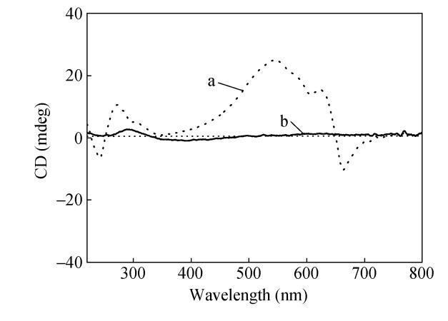 香豆素基團(tuán)在紫外光照條件下可發(fā)生可逆的光二聚反應(yīng):在365nm光輻照下,香豆素基團(tuán)能發(fā)生光二聚反應(yīng),在254nm輻照下香豆素二聚體能可逆地發(fā)生解二聚反應(yīng)。可以預(yù)見香豆素端基的二聚化將影響香豆素取代二乙炔單體在氣液界面的組裝,從而影響聚二乙炔主鏈螺旋結(jié)構(gòu)的形成。我們用365nm紫外燈輻照CODA氯仿溶液20min,此時(shí)香豆素端基能發(fā)生二聚,而二乙炔基團(tuán)不會(huì)發(fā)生聚合。將得到的CODA二聚體的氯仿溶液鋪展在水面上,沉積制備LB膜,制備得到的CODA二聚體LB膜能聚合成藍(lán)相。CD光譜測試發(fā)現(xiàn)香豆素基團(tuán)和相應(yīng)的聚二乙炔吸收帶均出現(xiàn)了明顯的CD信號(hào),但強(qiáng)度較CODA LB膜均有所減弱,如圖8所示。