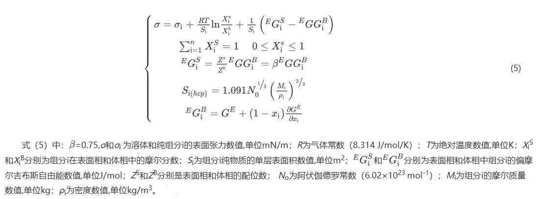 式(5)中:=0.75,σ和σi為溶體和純組分i的表面張力數(shù)值,單位mN/m;R為氣體常數(shù)(8.314 J/mol/K);T為絕對溫度數(shù)值,單位K;XiS和XiB分別為組分i在表面相和體相中的摩爾分?jǐn)?shù);Si為組分i純物質(zhì)的單層表面積數(shù)值,單位m2;分別為表面相和體相中組分i的偏摩爾吉布斯自由能數(shù)值,單位J/mol;ZS和ZB分別是表面相和體相的配位數(shù);No為阿伏伽德羅常數(shù)(6.02×1023 mol-1);Mi為組分i的摩爾質(zhì)量數(shù)值,單位kg;ρi為密度數(shù)值,單位kg/m3。