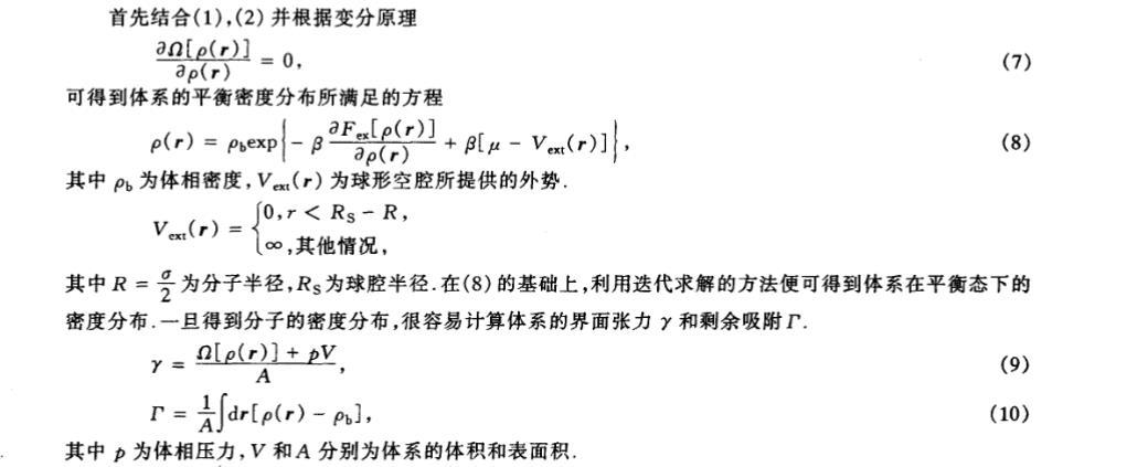 其中 R=σ/2 為分子半徑,Rs 為球腔半徑。在 (8) 的基礎(chǔ)上,利用迭代求解的方法便可得到體系在平衡態(tài)下的密度分布。一旦得到分子 的密度分布,很容易計(jì)算體系的界面張力 γ 和剩余吸附 Γ。