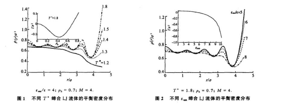 就非均勻體系而言,分子間 的排斥體積作用是使得密度呈振蕩分布的主要原因。然而,圖 1,2 表明 T 和 ε 也在很大程度上影響著體系平衡結(jié)構(gòu)。圖 1 中,密度分布曲線振蕩幅度隨著 T 的降低而衰減,且當(dāng) T=1.2 時(shí),曲線的振蕩趨勢(shì)幾乎完全消失。原因在于 T 越小,分子的無規(guī)運(yùn)動(dòng)能力越弱,分子間比較容易發(fā) 生締合并形成尺寸較大的團(tuán)簇結(jié)構(gòu)。在平衡態(tài)下,體系的最大構(gòu)象熵要求這些團(tuán)簇結(jié)構(gòu)向體相轉(zhuǎn)移,從而導(dǎo)致密度分布曲線振蕩趨勢(shì)的削弱和接觸密度的降低。然而,一旦增大 T*,分子無規(guī)運(yùn)動(dòng)能力的增強(qiáng)使得分子間很難形成穩(wěn)定的締合結(jié)構(gòu)。這在某種意義上降低了分子的締合能力,從而使分子間的排斥體積作用在更大程度上決定體系的平衡結(jié)構(gòu)。
