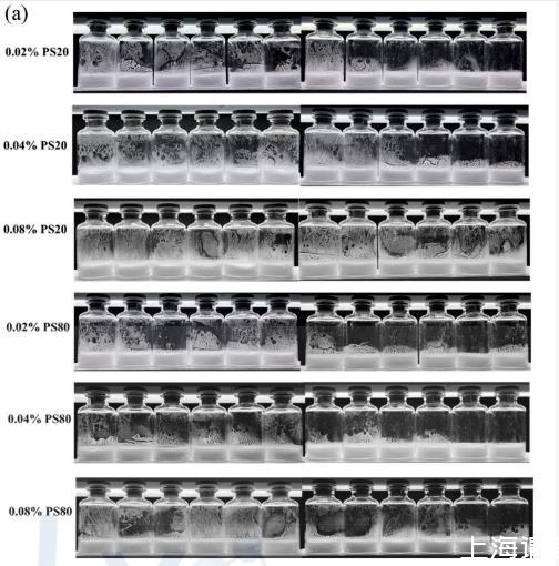 相應(yīng)地,使用PS20或更高濃度表面活性劑的處方,凍干后霧化也更嚴(yán)重。在相同濃度下,用PS20制備的樣品比用PS80制備的樣品霧化現(xiàn)象更嚴(yán)重。