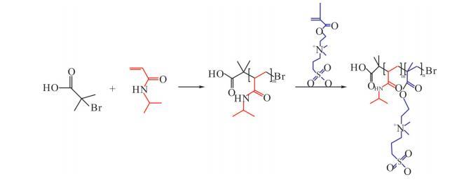 首先將a-溴代異丁酸(0.0167g,相當(dāng)于0.1mmol)、NIPAM單體和5mL去離子水加入至真空反應(yīng)管I中。隨后,利用超聲處理直至所有固體組分完全溶解,充入氮?dú)庾鳛楸Wo(hù)氣持續(xù)10min。另外,在真空反應(yīng)管II中添加CuBr(0.0036g,0.025mmol)和2mL去離子水,進(jìn)一步加入Me。TREN配體(13.4μL,0.05 mmol)和PMDETA配體(8.9μL,0.05mmol),充入氮?dú)獗Wo(hù)10min。在保持氮?dú)夥諊臈l件下,使用真空注射器將真空反應(yīng)管I中的內(nèi)容物轉(zhuǎn)移到真空反應(yīng)管II中并進(jìn)行密封,反應(yīng)30min。此外,在真空反應(yīng)管III中將甜菜堿單體和5mL去離子水混合,經(jīng)過(guò)超聲處理直到完全溶解,充入氮?dú)獗Wo(hù)10min。NIPAM聚合反應(yīng)啟動(dòng)1h后,再將真空反應(yīng)管III中的物質(zhì)通過(guò)真空注射器,在氮?dú)獗Wo(hù)下加入到反應(yīng)管II中,繼續(xù)反應(yīng)2h以確保反應(yīng)徹底完成。反應(yīng)完成后,將反應(yīng)液置入截留分子量為3500的透析袋中,用去離子水透析48h,每8h更換一次水。最終,將透析后的溶液進(jìn)行冷凍干燥處理,去除所有水分,從而得到最終產(chǎn)物。在整個(gè)合成過(guò)程中,控制加入的單體總的物質(zhì)的量為10mmol,根據(jù)NIPAM的加入比例(分別為100%,80%,50%,40%,20%和0%)合成了一系列P(NIPAM-b-DMMPPS)嵌段聚合物。這些聚合物根據(jù)其NIPAM的比例命名為PN_100,PN_80,PN_50,PN_40,PN_20和PN_0,以便于后續(xù)的實(shí)驗(yàn)分析與研究。精確控制實(shí)驗(yàn)條件和原料比例。聚合過(guò)程如Scheme1所示。