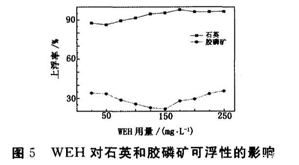 由圖5看出,使用WEH后,石英上浮率可以提高到90%以上。當(dāng)WEH用量低于150 mg/L時(shí),ZB和磷酸對(duì)膠磷礦的抑制作用不明顯;當(dāng)用量超過150 mg/L時(shí),膠磷礦上浮率逐步上升,石英和膠磷礦上浮率差異可達(dá)77個(gè)百分點(diǎn),實(shí)現(xiàn)了石英和膠磷礦的有效分離。