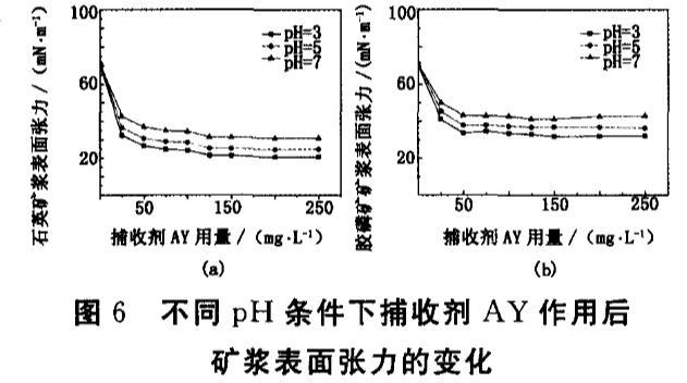 通過測(cè)試礦漿表面張力可以考察在調(diào)整劑作用下捕收劑AY在石英和膠磷礦礦漿中的活性,和捕收劑AY在礦漿中的臨界膠束質(zhì)量濃度[8],從而分析捕收劑AY與石英和膠磷礦的作用方式。