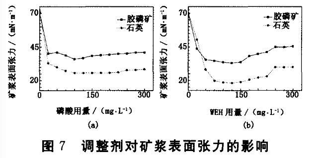 圖7(b)所示的是添加不同用量WEH對(duì)礦漿表面張力的影響,隨著WEH用量增加,礦漿表面張力呈現(xiàn)陡然下降后平穩(wěn),當(dāng)用量超過150 mg/L時(shí),呈現(xiàn)緩慢上升趨勢(shì)。通過與圖7(a)所示的結(jié)果進(jìn)行對(duì)比,WEH使石英礦漿表面張力顯著下降,最低可降到18.16 mN/m,WEH可使捕收劑AY在礦漿中的表面活性增高,臨界膠束質(zhì)量濃度降到75 mg/L,利于石英和膠磷礦上浮,但此時(shí)礦漿體系中存在的ZB和磷酸對(duì)膠磷礦有抑制作用,而WEH主要是提高在石英表面的吸附,此外WEH存在醚胺陽(yáng)離子活性基團(tuán),易吸附于石英表面,因此WEH是較好的脫硅增效劑。