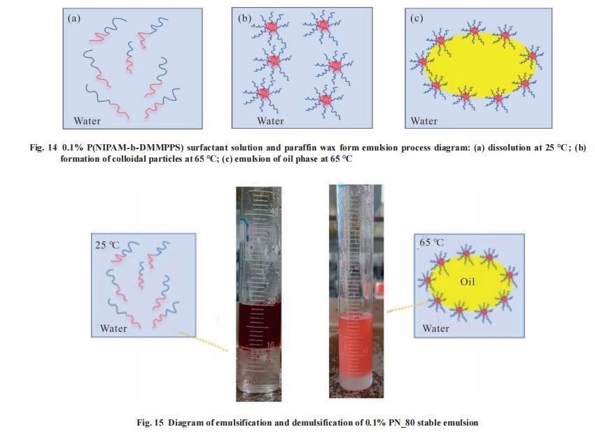Fig.14展示了P(NIPAM-b-DMMPPS)形成乳液的機(jī)理圖,在25°C時(shí),P(NIPAM-b-DMMPPS)雙嵌段聚合物的PNIPAM鏈段和PDMMPPS鏈段都處于親水狀態(tài)并且舒展開來,使得其能夠溶解在水中。因?yàn)樵谶@個(gè)溫度時(shí),PNIPAM鏈段的酰胺基與水分子之間形成了氫鍵,表現(xiàn)出親水性,而PDMMPPS鏈段親水性強(qiáng),能與水分子相互作用,使整個(gè)聚合物分子充分溶解。當(dāng)溫度升高到65°C時(shí),PNIPAM鏈段的氫鍵在高溫時(shí)被破壞,導(dǎo)致其變得疏水并發(fā)生收縮;與此同時(shí),PDMMPPS鏈段依然保持親水性并舒展開來。這種不同的溫度響應(yīng)性質(zhì)使得P(NIPAM-b-DMMPPS)聚合物在水溶液中形成了以疏水的PNIPAM為核,親水的PDMMPPS為殼的微米級球狀膠體顆粒。在這種結(jié)構(gòu)形態(tài)下,當(dāng)表面活性劑(即這種雙嵌段聚合物)與油混合并進(jìn)行乳化時(shí),疏水的PNIPAM核可以與油相容,而親水的PDMMPPS殼則可以與水相容,從而穩(wěn)定地分散在連續(xù)水相中。這樣,就形成了穩(wěn)定的乳液。
