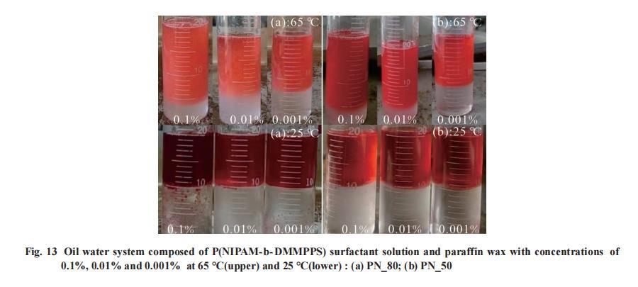 選用PN_80和PN_50進(jìn)行乳化性能測試,以石蠟油為模擬油,配置質(zhì)量分?jǐn)?shù)分別為0.1%,0.01%和0.001%的表面活性劑水溶液,以油水比1:1組成油水體系,乳化結(jié)果如Fig.13所示。在65℃時(shí),探討不同濃度的PN_50表面活性劑溶液形成乳液的能力時(shí),觀察到質(zhì)量分?jǐn)?shù)為0.1%和0.01%的溶液都能形成穩(wěn)定的乳液,而質(zhì)量分?jǐn)?shù)為0.001%的溶液則不能形成穩(wěn)定的乳液。這一現(xiàn)象可以通過分析表面活性劑分子在界面上的分布和作用來解釋。首先,表面張力測試結(jié)果表明,在較高質(zhì)量分?jǐn)?shù)(0.1%和0.01%)下,PN_50表面活性劑能夠有效地降低水的表面張力,這是因?yàn)楸砻婊钚詣┓肿幽軌蛟谒陀偷慕缑嫔闲纬梢粚又旅艿哪?,從而降低界面張力,促進(jìn)乳液的形成和穩(wěn)定。在這種濃度下,表面活性劑分子的數(shù)量足夠多,可以完全覆蓋在分散相液滴的表面,形成一層保護(hù)性的膜,阻止液滴之間的合并。然而,當(dāng)質(zhì)量分?jǐn)?shù)降至0.001%時(shí),表面活性劑分子數(shù)量顯著減少,不足以在界面形成連續(xù)且有效的覆蓋層。這導(dǎo)致無法有效降低表面張力,同時(shí)也無法防止分散相液滴之間的直接接觸和合并,因此無法形成穩(wěn)定的乳液。25℃時(shí),PN_503種濃度表面活性劑溶液都能夠發(fā)生破乳。對于PN_80來說,65℃時(shí),質(zhì)量分?jǐn)?shù)為0.1%,0.01%,0.001%的表面活性劑溶液均發(fā)生了乳化,25℃時(shí),各乳液均能發(fā)生破乳,通過比較發(fā)現(xiàn),0.01%和0.001%2種表面活性劑溶液破乳效果更好。乳化實(shí)驗(yàn)結(jié)果表明,在一定的濃度范圍內(nèi),PN_80和PN_502種溶液均能夠在65℃發(fā)生乳化,25℃發(fā)生破乳,體現(xiàn)了該嵌段表面活性劑具有良好的溫度誘導(dǎo)的乳化、破乳行為。