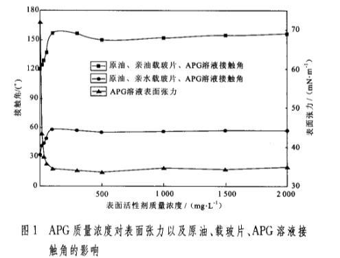 圖1 APG質(zhì)量濃度對(duì)表面張力以及原油、載玻片、APG溶液接觸角的影響