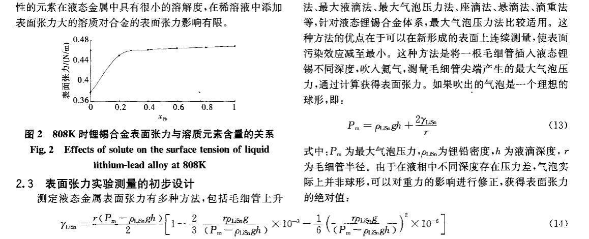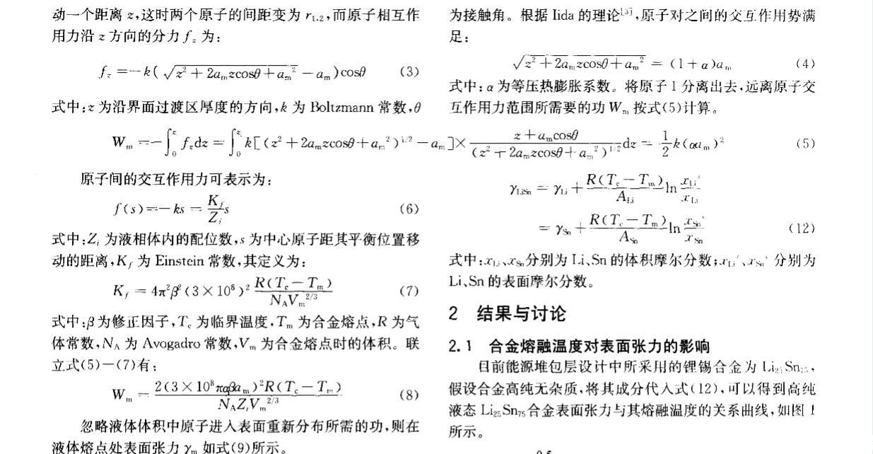 核能是公認(rèn)現(xiàn)實可行的、可大規(guī)模替代常規(guī)能源的清潔能源。聚變堆或聚變_裂變混合堆液態(tài)金屬包層因其固有特性和優(yōu)勢,在國際上被普遍認(rèn)為是未來電站最具發(fā)展?jié)摿Φ陌鼘釉O(shè)計方案之一。作為包層氚增殖劑和冷卻劑的鋰錫合金與鋰鉛合金一樣,具有廣闊的發(fā)展前景,其制備、純化、質(zhì)量輸運(yùn)等工藝難題正逐步得到重視。液態(tài)金屬的表面張力不僅是認(rèn)識和理解冶煉過程最基本的物理量之一,而且是氣體吸收、氣泡形核、雜質(zhì)生長等界面現(xiàn)象的控制因素。目前對液態(tài)金屬表面張力的研究多集中于金屬單質(zhì),合金的表面或界面行為在理論或?qū)嶒炆隙枷喈?dāng)不足,主要是由于精確確定表面張力十分困難[2]。針對液態(tài)鋰錫合金這種新型的核材料,從基礎(chǔ)研究方面看,目前還沒有一種實驗方法能確定液體界面的結(jié)構(gòu),即兩個相之間過渡區(qū)域的結(jié)構(gòu),因此需要有一些假設(shè)或模型來滿足表面張力理論的研究。