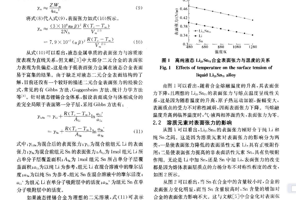 由圖l可以看出,隨著合金熔融溫度的升高,其表面張力下降,且理想的Li Sn;的表面張力與熔點溫度呈線性關(guān)系,這是因為隨著溫度的升高,原子熱運(yùn)動加劇,振幅變大,表面質(zhì)點的受力不對稱性減弱,因而表面張力下降。當(dāng)熔融溫度升高到臨界溫度時,氣一液兩相界面消失,表面張力為零。