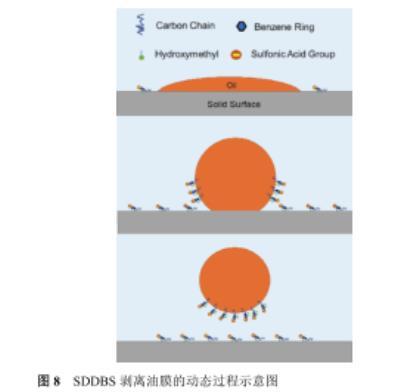 如圖8所示,SDDBS剝離油膜機理可從以下三個方面進行闡釋,首先SDDBS吸附在油水界面上降低了油水界面張力;其次,SDDBS的二羥基通過氫鍵作用強化了其與巖石表面吸附,磺酸基團富集于巖石表面使得巖石表面由親油轉(zhuǎn)變?yōu)閺娪H水,極大地增加了油滴在巖石表面接觸角,降低粘附功而使得油膜易于剝離;最后,由于SDDBS在油水界面和巖石表面同時吸附,增加剝離后油滴與巖石表面間的靜電斥力,使得剝離后油膜不易重新粘附壁面,實現(xiàn)高效剝離。