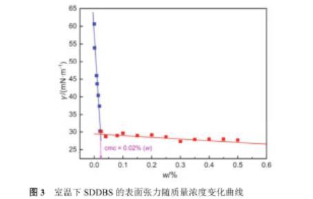 圖3室溫下SDDBS的表面張力隨質(zhì)量濃度變化曲線